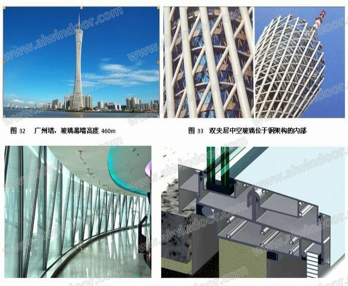 广州塔高度600m,玻璃幕墙高度460m(图32、图33)。明框玻璃幕墙采用三角形单元板块,尺寸为1500mm X 3500mm。双夹层半钢化中空玻璃,(8mm+1.52mmSGP+8mm)+12mmA+(8mm+1.52mmSGP+8mm)(图34~图37)。