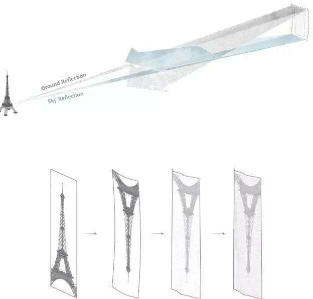 MAD的改造方案,根据光学凹镜原理,将建筑立面的每一片玻璃设定到特定角度,使得整个大楼成为一个城市尺度的凹面镜。在这种光学效应下,楼体所反射的周边景色被上下翻转,巴黎城市的街区,道路以至于周边建筑的屋顶被反射,并倒挂在空中;地平线以上的天空却反射在楼体的下半部分,与背景天空完全相融。海市蜃楼般飘浮在空中的“倒挂巴黎城”就这样形成;如果从埃菲尔铁塔望向大楼,更会看到大楼建筑立面上出现另一座上下翻转的铁塔。